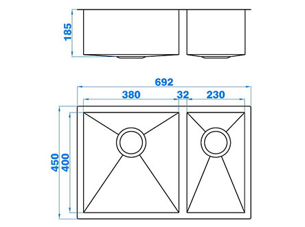 型號(hào):710L款式:雙盆安裝方式:臺(tái)底式總尺寸:692*450 mm大盆:380*400*185 mm小盆:380*400*185 mm